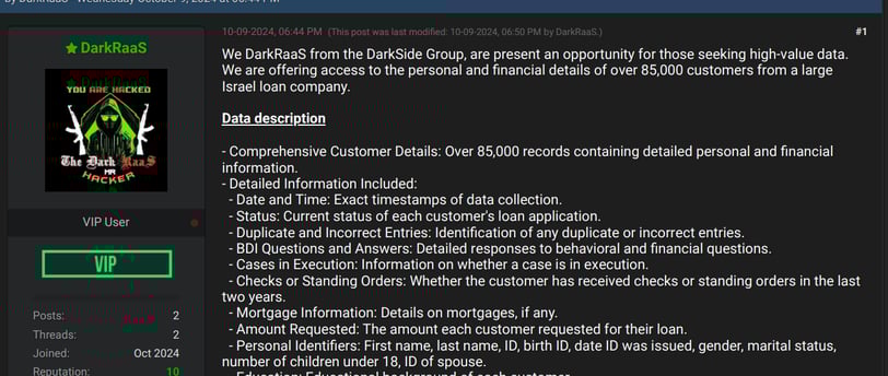 Sipas KELA-s, DarkRaaS pretendoi se kishte shënjestruar nëntë entitete izraelite gjatë tetorit me vjedhje të të dhënave dhe sulme të tjera. Kjo përfshin shitjen e 85,000 të dhënave të klientëve nga një kompani huash, si dhe disa lloje aksesi në asetet e organizatave të ndryshme: rrjeti cloud i një komune, rrjeti cloud i një kompanie izraelite të veshjeve Omall, sistemet CRM të një kompanie të madhe marketingu, një agjencie mjekësore izraelite, serverat e një kolegji teknologjik, një kompanie energjetike izraelite dhe një konglomerati të madh financiar në Izrael.